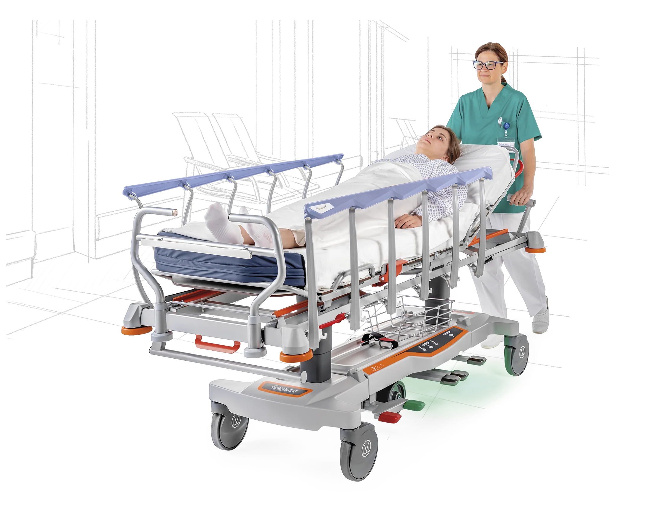 La conception du barrieres latérales de VELA, faite de matériaux innovants, rend le chariot brancard léger et pratique.