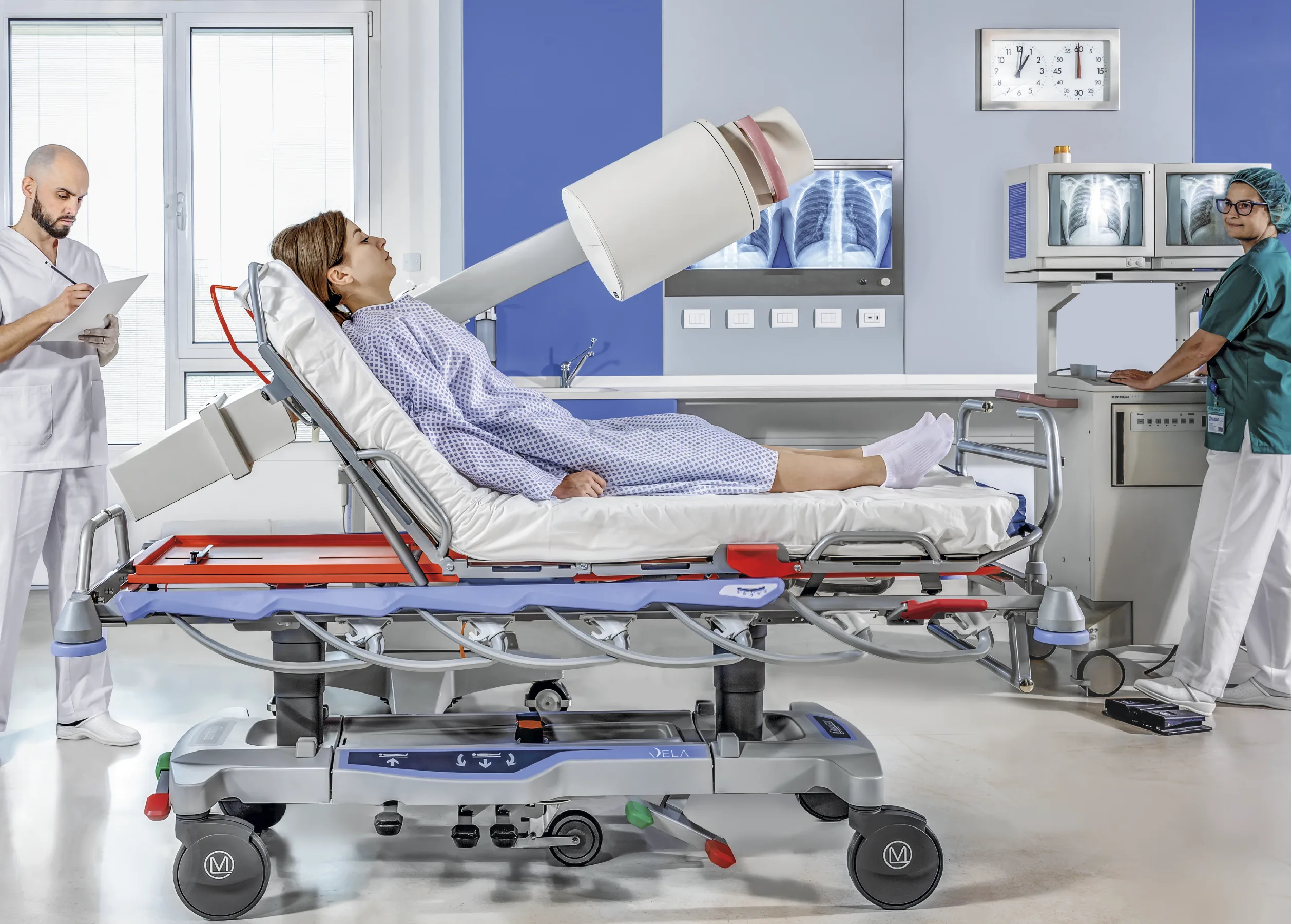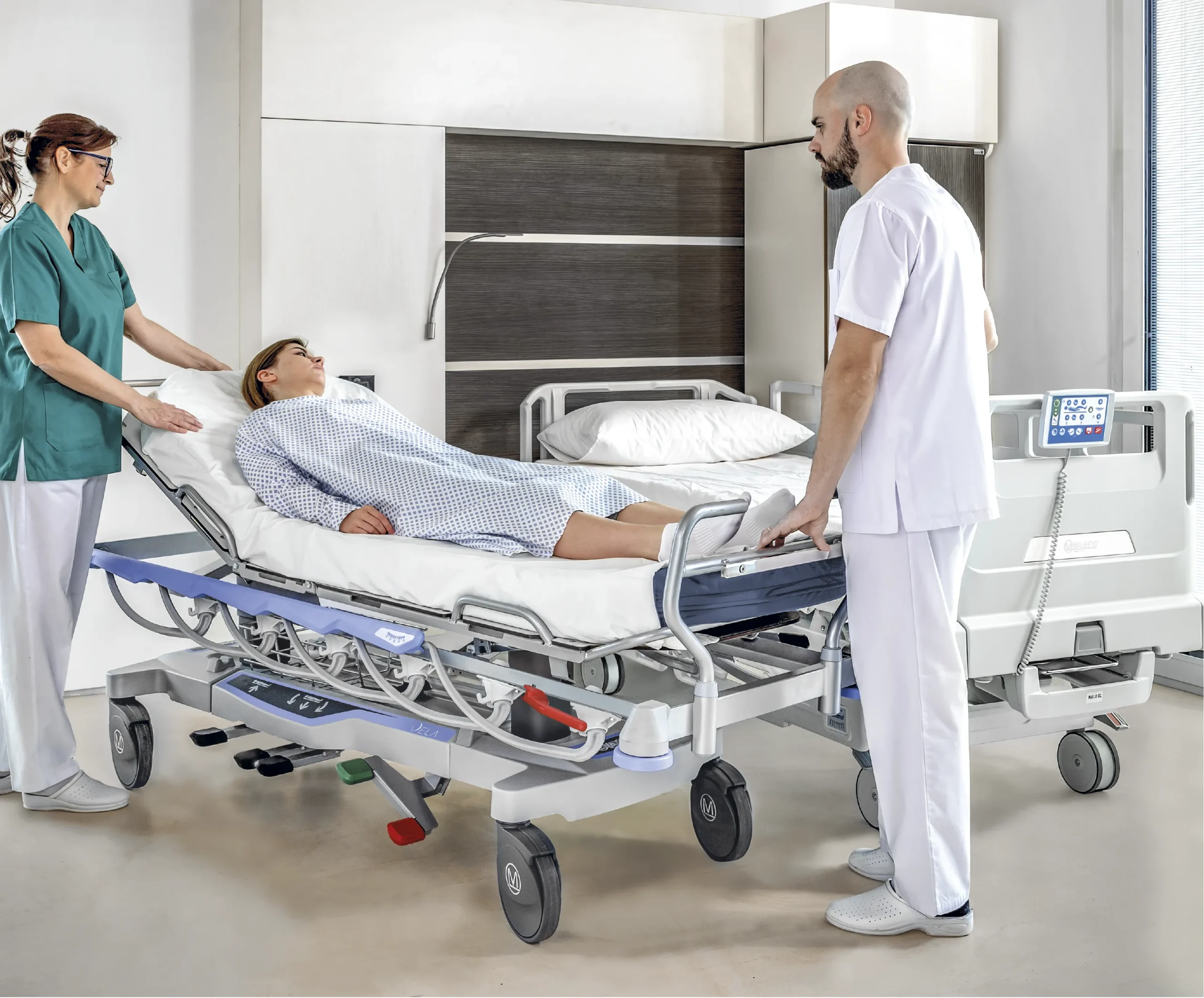 Le mécanisme de rails latéraux optimise l’espace et facilite l’interaction entre les soignants et les patients, faisant du chariot brancard un outil de soins.