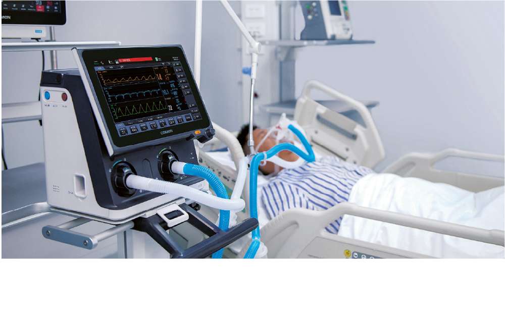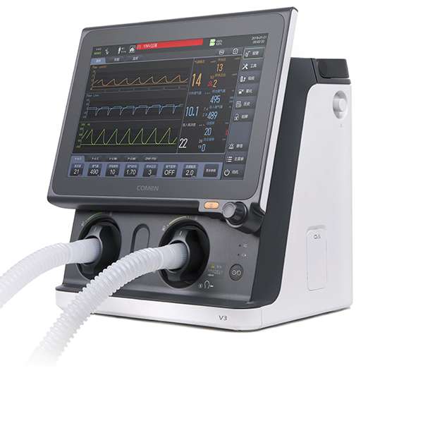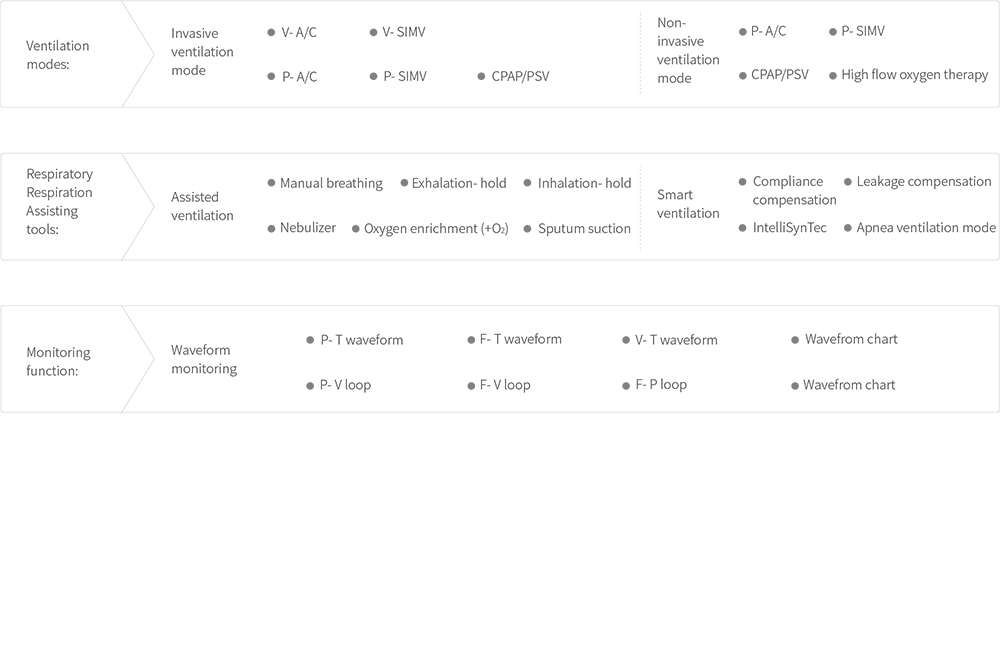 - Respirateur de réanimation à turbine haute performance juqu’au 210l/min, qui peut gérer une variété de scénarios, y compris la ventilation invasive, non invasive et therapie en O2 en service de réanimation, soins intensif, et le transport intra-hospitalier et urgence.